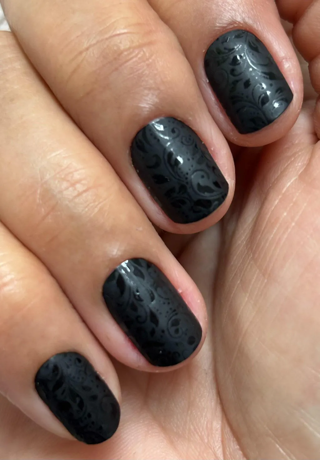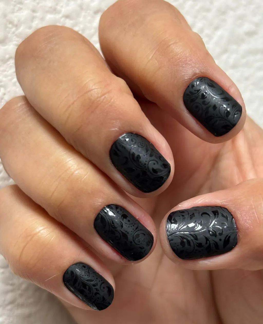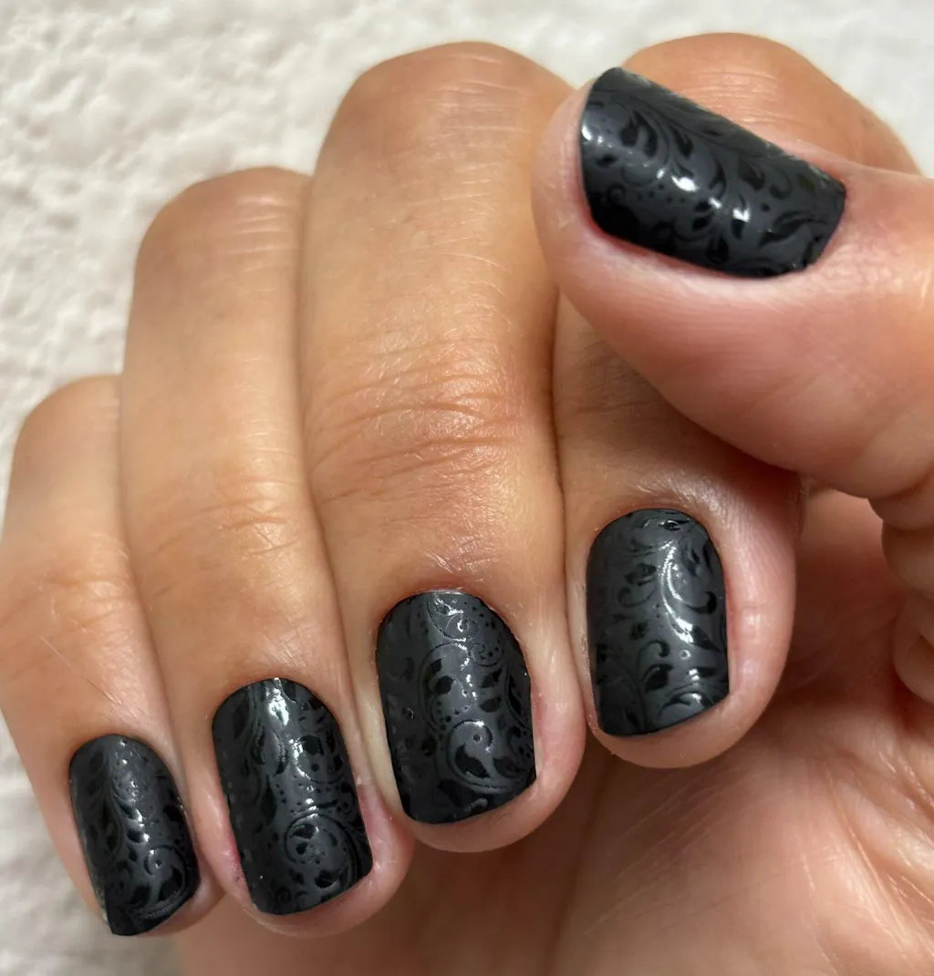 SPECIAL NOTE: This set is both matte and glossy, a tone-on-tone look. It is beautiful, but once you add a top coat it will be just black, the design will disappear. With this set we recommend good prep for adhesion, and then wait to top coat for a few days. Enjoy the Matte/Glossy design then top coat for durability. During the time without a top coat please refrain from using sunscreens, lotions and high temperatures.